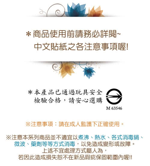 5.本體有髒污時,請以濕布擦拭,請勿以煮沸、熱水、微波爐、藥劑、各式消毒鍋等方式加熱消毒,避免造成玩具變形損壞。